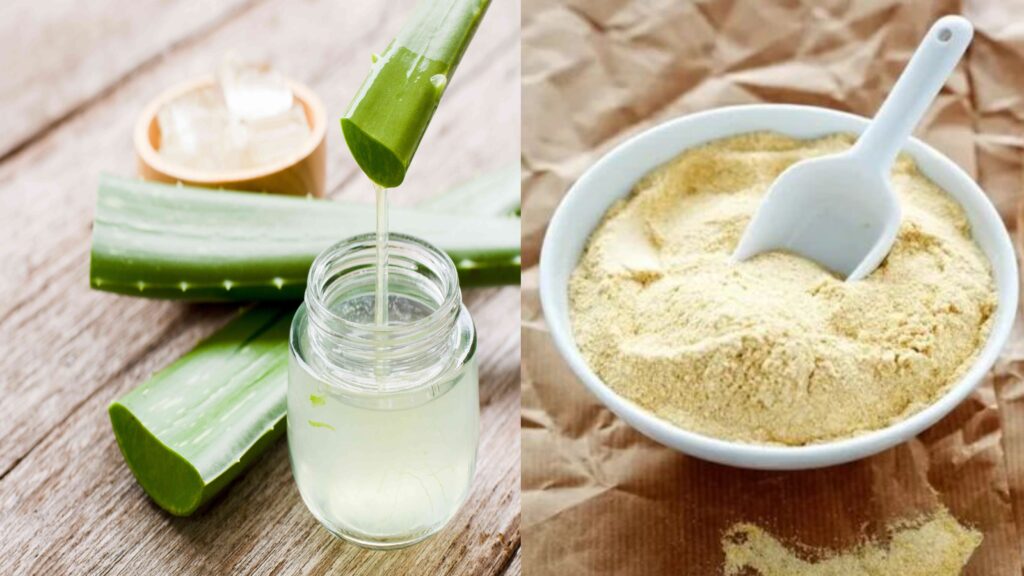एलोबेरा और बेसन का उपयोग निखरी और चमकदार चेहरे के एक बेहतरीन घरेलु उपाय हैं | जब इन दोनों को मिलाकर फेस पैक बनाया जाता हैं तो ये स्किन को दीप क्लीन करते हैं और निखरलाते हैं और वही बेसन एक प्राकृतिक क्लीनर की तरह कम करता हैं , जो मृत कोशिकाओ और अतिरिक्त तेल को हटाकर त्वचा को साफ और ताज़ा बनाने में सहायक होता हैं |